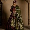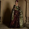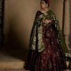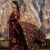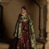 Adorned with intricate bronze tilla and green silk thread embroidery, as well as golden sequin detailing, this pishwas is truly a work of art. The floral clusters scattered throughout add a touch of elegance and charm. The deep maroon hue of the pishwas evokes a sense of longing and captivates the beholder’s gaze.